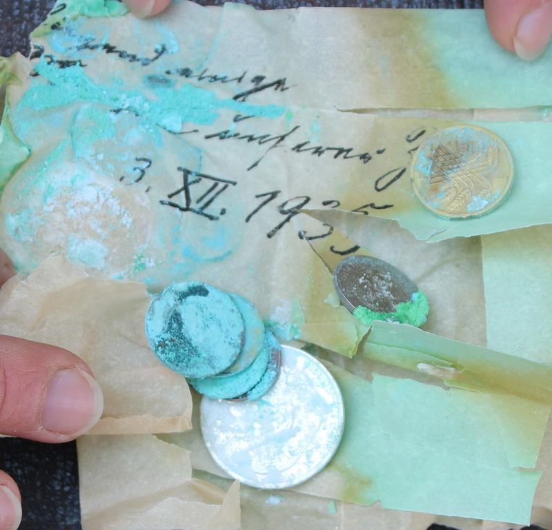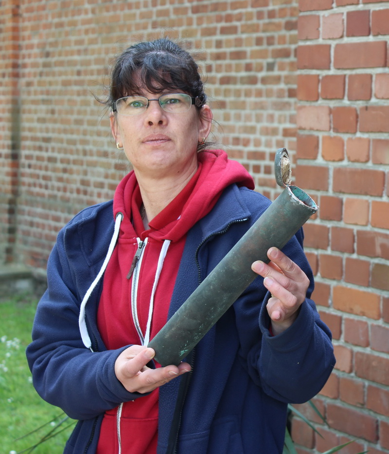 Aufbewahrungsgefäß der Dokumente von 1935 Diese Kartusche war verlötet und wird von Angelika Müller präsentiert. |