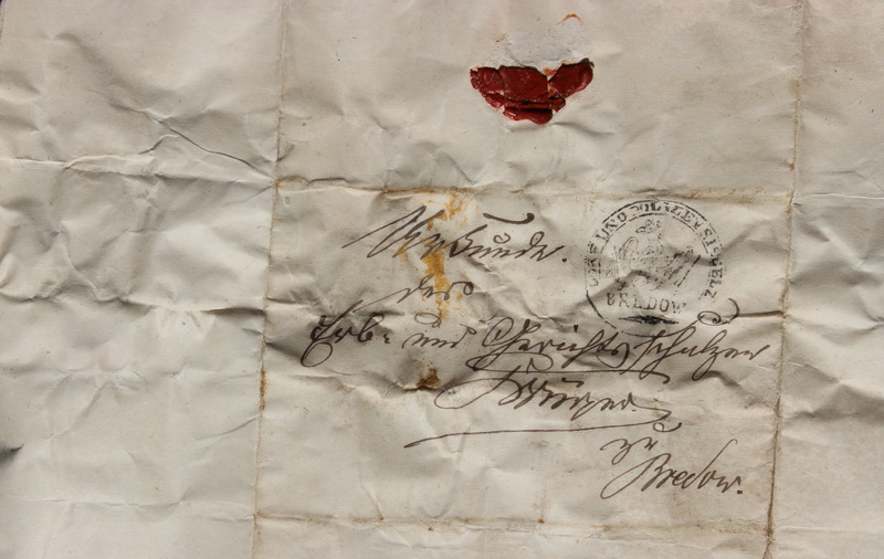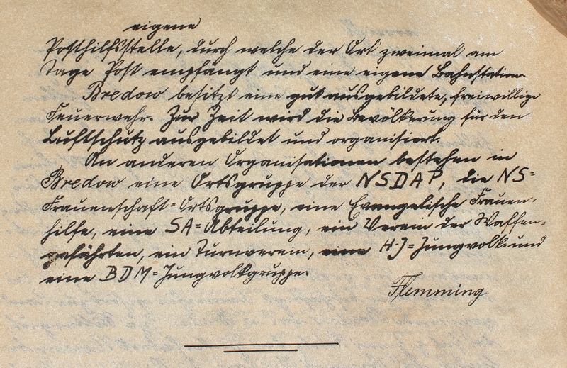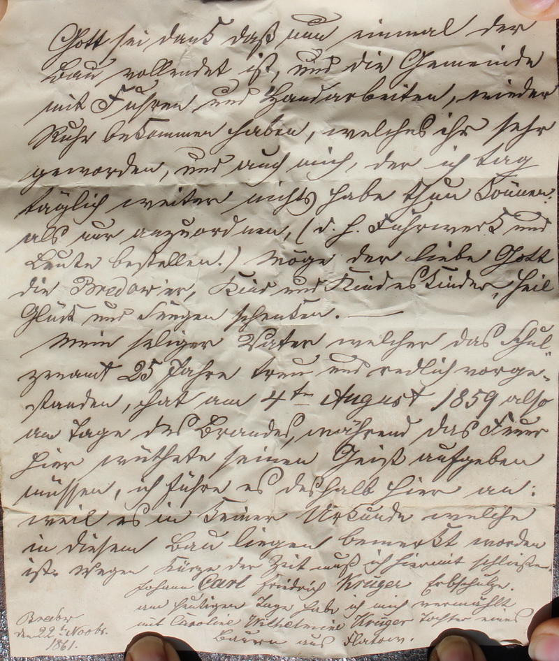Gott sei dank, daß nun einmal der Bau vollendet ist, und die Gemeinde mit Fuhren und Handarbeiten, wieder Ruhe bekommen haben, welches ihr sehr geworden, und auch mich, der ich tag täglich weiter nichts habe thun können als nur anzuordenen, (d.h. Fuhrwerk und Leute bestellen.) Möge der liebe Gott die Bredower, Kind und KindesKinder , Heil Glück und Segen schenken. Mein seliger Vater welcher das Schul- zenamt 25 Jahre treu und redlich vorge- standen, hat am 4 ten August 1859 also am Tage des Brandes, während das Feuer hier wüthete seinen Geist aufgeben müssen, ich führe es deshalb hier an weil es in keiner Urkunde welche in diesem Bau liegent bemerkt worden ist. Wegen Kürze der Zeit muß ich hiermit schließen. Johann Karl Friedrich Krüger Erbschulze. am heutigen Tage habe ich mich vermählt mit Caroline Wilhelmine Krüger Tochter eines Bauern aus Flatow Bredow den 22 tn Novbr. 1861 |