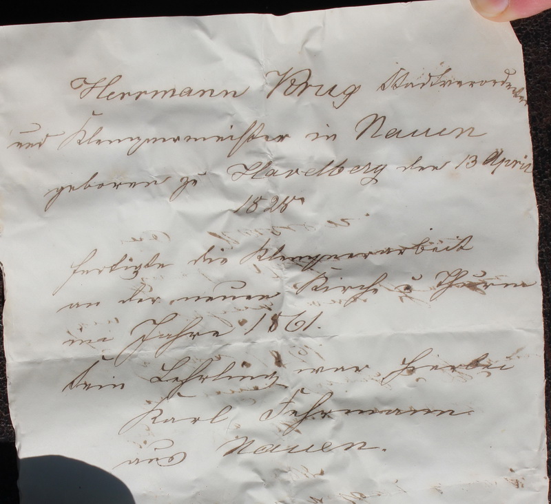 Kirche 1861 Klempnerarbeiten Herrmann Krug Stadtverordneter und Klempnermeister in Nauen geboren zu Havelberg den 13 April 1828 fertigte die Klempnerarbeit an der neuen Kirche u Thurm im Jahre 1861 Sein Lehrling war hierbei Karl Fehrmann aus Nauen |
