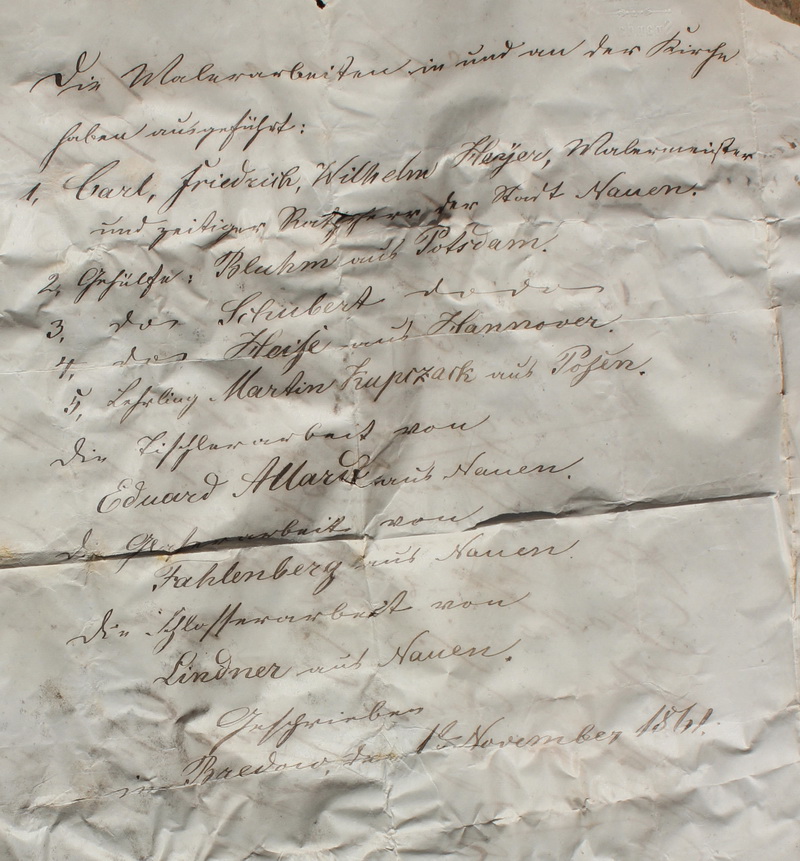 Kirche 1861 Malerarbeiten Die Malerarbeit in und an der Kirche haben ausgeführt: 1.Carl Friedrich Wilhelm Heyer, Malermeister und zeitiger Rathsherr der Stadt Nauen. 2. Gehülfe: Bluhm aus Potsdam 3. " Schubert " 4. " Heise aus Hannover 5. Lehrling Martin Kupczack aus Posen die Tischlerarbeit von Eduard Allardt aus Nauen die Glaserarbeit von Fahlenberg aus Nauen die Schlosserarbeit von Lindner aus Nauen geschrieben in Bredow den 1. November 1861 |
