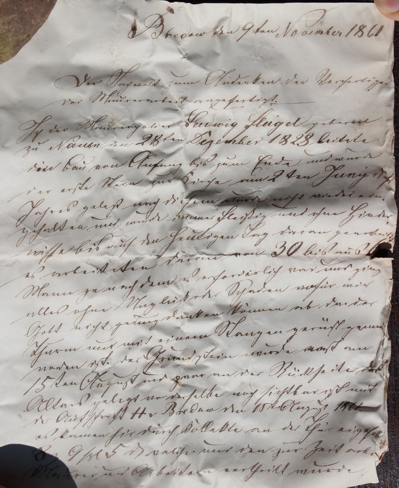 Kirche 1861 Maurerarbeiten Bredow den 9ten November 1861 Der Nachwelt zum Andenken der Verfertiger der Maurerarbeit angefertigt. Ich der Maurerpolier Ludwig Flügel geboren zu Nauen den 28 ten Dezember 1828 leitete den Bau von Anfang bis zum Ende und wurde der erste Stein zur Kirche am 2 ten Juny Vohr? Jahres gelegt nach diesem wurde nicht ein- gehalten und wurde immer fleißig und ohne Hinder nisse bis auf den heutigen Tag daran gearbeitet es arbeiteten daran von 30 bis an 66 Mann nachdem es erforderlich war und ging alles ohne Unglück oder Schaden wofür wir Gott nicht genug danken können ab. Da der Thurm nur mit einem Stangengerüst gemauert worden ist, der Grundstein wurde noch am 15 ten August und zwar an der Rückseite des Altars gelegt wo derselbe noch sichtbar ist mit der Aufschrift H v Bredow den 15 tn August 1861 es kamen hirdurch Kollekte an der Thür eigesam… 8 ? 9 ? 5 ? welche uns den zur Zeit arbei Maurer und Arbeitern ertheilt wurde. |