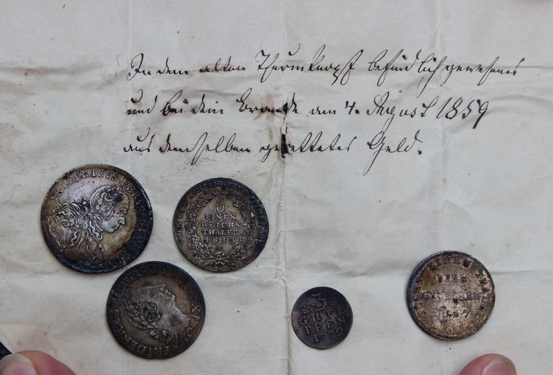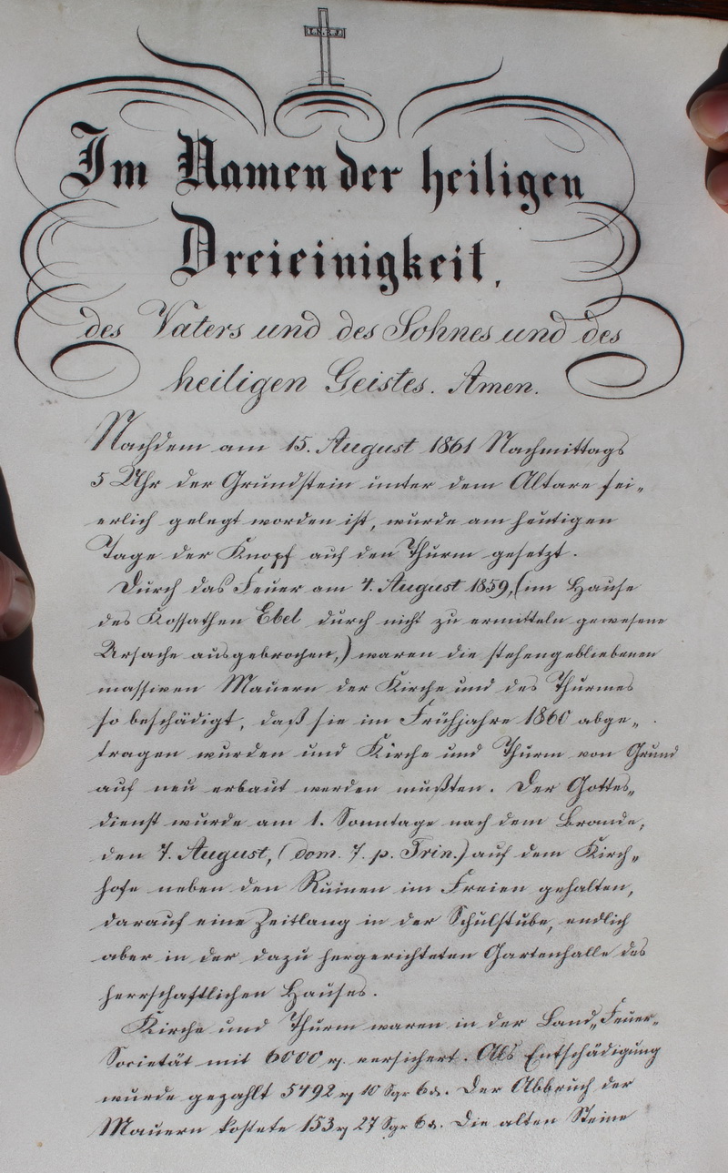 [Anm. 2015: Das Papier bestand aus tadellos erhaltenem Pergament.] Im Namen der heiligen Dreieinigkeit des Vaters und des Sohnes und des heiligen Geistes. Amen Nachdem am 15. August 1861 Nachmittags 5 Uhr der Grundstein unter dem Altar fei- erlich gelegt worden ist, wurde am heutigen Tage der Knopf auf den Thurm gesetzt. Durch das Feuer am 4. August 1859 (im Hause des Kossathen Ebel durch nicht zu ermitteln gewesene Ursache ausgebrochen) waren die stehengebliebenen massiven Mauern der Kirche und des Thurmes so beschädigt, daß sie im Frühjahr 1860 abge- tragen wurden und Kirche und Thurm von Grund auf neu erbaut werden mußten. Der Gottes- dienst wurde am 1. Sonntage nach dem Brande, den 7. August, (dom. 7. 9. Trin.) auf dem hofe neben den Ruinen im Freien gehalten, darauf eine Zeitlang in der Schulstube, endlich aber in der dazu hergerichteten Gartenhalle des herrschaftlichen Hauses. Kirche und Thurm waren in der Land "Feuer- Societät mit 6000 ?? versichert. Als Entschädigung wurde gezahlt 5492 ? 10 ? 6 ?. Der Abbruch der Mauern kostete 153 ? 27? 6? Die alten Steine |