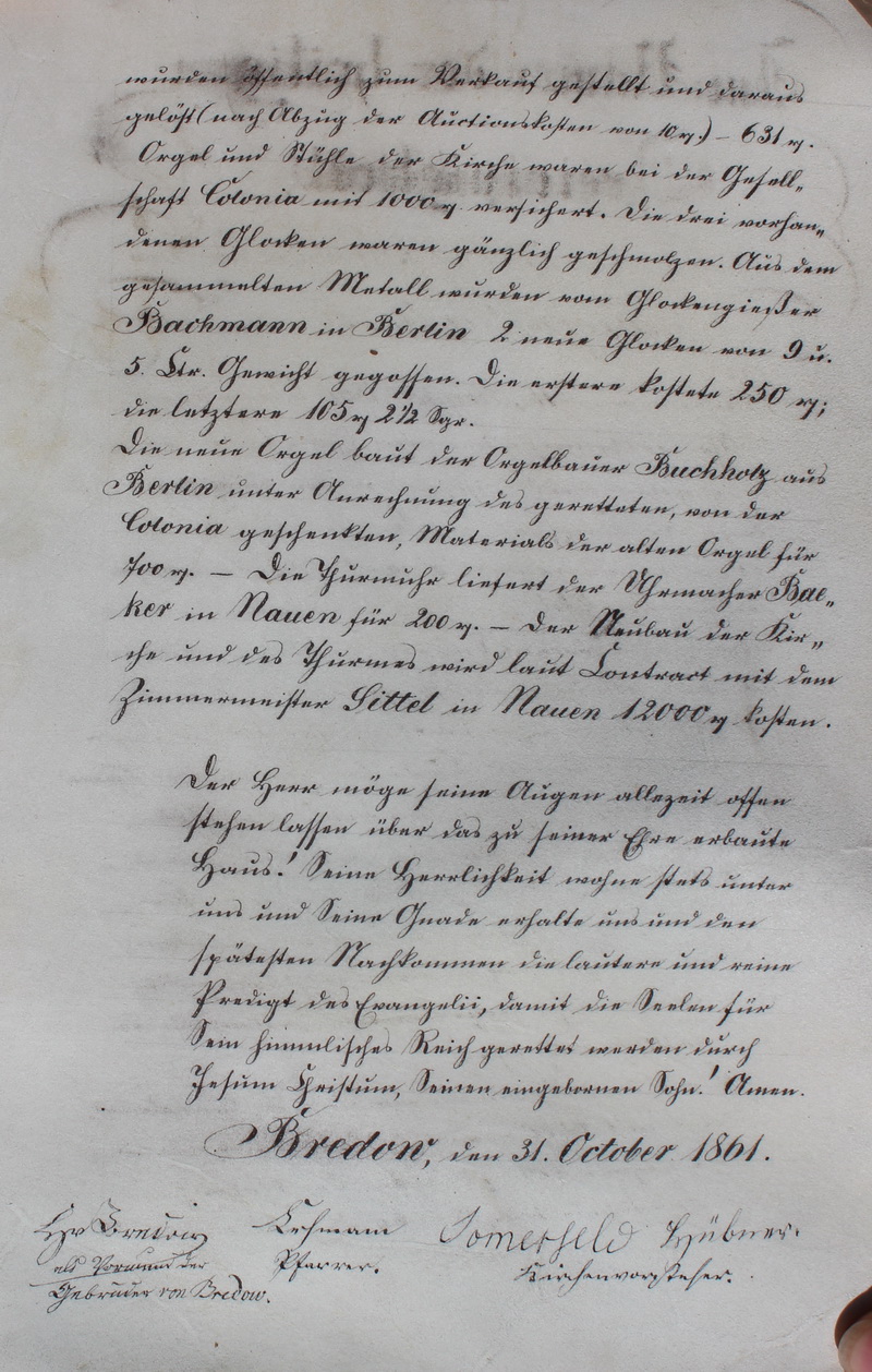 wurden öffentlich zum Verkauf gestellt und daraus gelöst (nach Abzug der Auctionskosten von 10 ?) 631 ? Orgel und Stühle der Kirche waren bei der Gesell- schaft Colonia mit 1000 ? versichert. Die drei vorhan- denen Glocken waren gänzlich geschmolzen. Aus dem gesammelten Metall wurden vom Glockengießer Bachmann in Berlin 2 neue Glocken von 9 u. 5 Ltr. Gewicht gegossen. Die erstere kostete 250 ? die letztere 105 ? 2 ½ ? Die neue Orgel baut der Orgelbauer Buchholz aus Berlin unter Anrechnung des geretteten, von der Colonia geschenkten Materials der alten Orgel für 700 ?. - Die Thurmuhr liefert der Uhrmacher Bae ker in Nauen für 200 ? - der Neubau der Kir- che und des Thurmes wird laut Contract mit dem Zimmermeister Sittel in Nauen 12000 ? kosten. Der Herr möge seine Augen allzeit offen stehen lassen über das zu seiner Ehre erbaute Haus! Seine Herrlichkeit wohne stets unter uns und Seine Gnade erhalte uns und den spätesten Nachkommen die lautere und reine Predigt des Evangelii, damit die Seelen für Sein himmlisches Reich gerettet werden durch Jesum Christum, Seinen eingebornen Sohn ! Amen. Bredow, den 31. October 1861