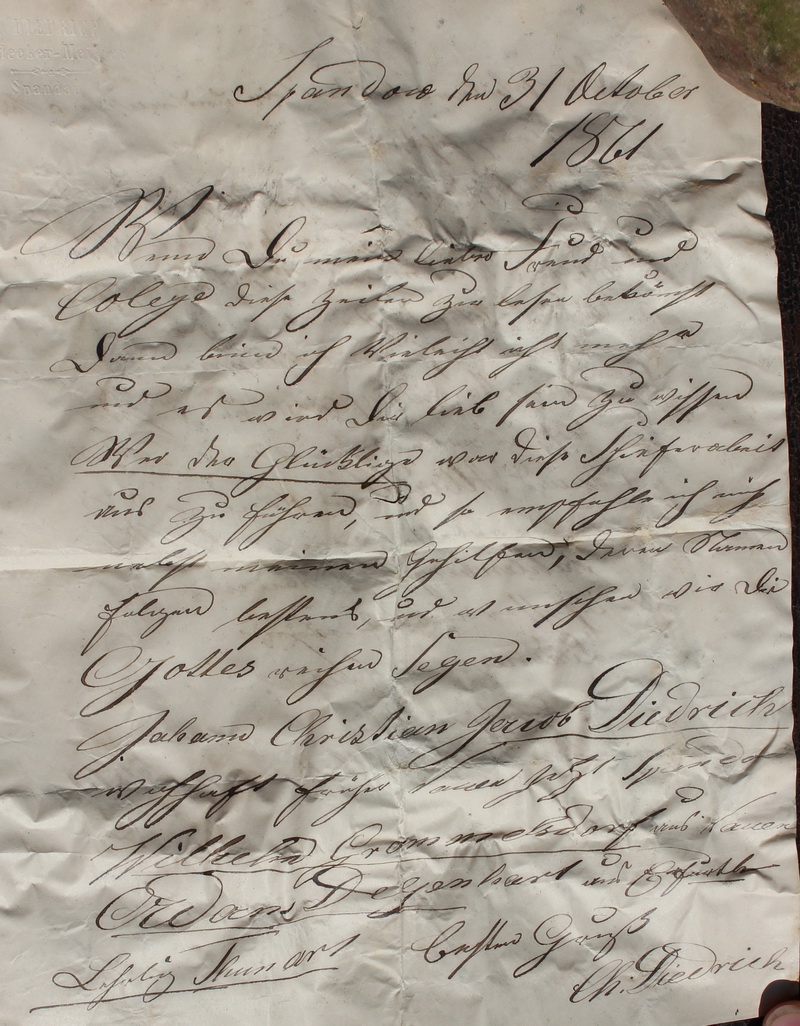 Kirche 1861 Schieferarbeiten Spandow den 31 October 1861 Wenn Du mein lieber Freund und Colege diese Zeilen zu lesen bekömst dann bin ich vielleicht nicht mehr und es wird Dir lieb sein zu wissen Wer der Glückliche war diese Schieferarbeit aus zu führen, und so empfehle ich mich nebst meinen Gehilfen deren Namen folgen bestens, und wunschen wir Di Gottes reichen Segen. Johann Christian Jacob Diedrich wohnhaft früher und jetzt Spandow Wilhelm Grommelsdorf aus Nauen Adam Degenhart aus Erfurth Lehrling Thunars besten Gruß Ch. Diedrich |