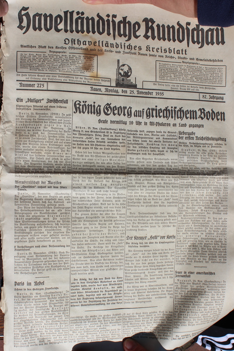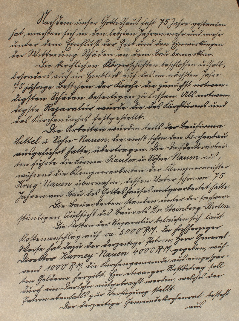 Im Namen ... - Seite 2 Nachdem unser Gotteshaus fast 75 Jahre gestanden hat, machten sich in den letzten Jahren mehr und mehr unter dem Einfluß der Zeit und den Einwirkungen der Witterung Schäden an dem Bau bemerkbar. Die kirchlichen Körperschaften beschlossen deshalb, besonders auch im Hinblick auf das im nächsten Jahre 75 jährigen Bestehen der Kirche die zunächst notwen- digsten Schäden beseitigen zu lassen. Als notwen- digste Reparatur wurde die des Kirchturms und des Kirchendaches festgestellt. Die Arbeiten wurden teils der Baufirma Sittel u. Sohn - Nauen, die einst schon den Kirchenbau ausgeführt hatte, übertragen. Die Dachdeckerarbei- ten führte die Firma Rauter u. Söhne - Nauen aus, während die Klempnerarbeiten der Klempnermeister Krug - Nauen übernahm, dessen Vater schon vor 75 Jahren am Bau des Gotteshauses mitgearbeitet hatte. Die Bauarbeiten standen unter der sachver- ständigen Aufsicht des Baurats Dr. Steinberg - Berlin. Die Kosten der Reparatur belaufen sich laut Kostenanschlag auf ca. 5000 RM. In hochherziger Weise hat dazu der derzeitige Patron, Herr General- direktor Harney - Nauen 4000 RM gegeben, wäh- rend 1000 RM die Kirchengemeinde aus eingespar- ten Geldern hergibt. Ein etwaiger Restbetrag soll durch ein Darlehn aufgebracht werden, welches der Patron ebenfalls zur Verfügung stellt. Der derzeitige Gemeindekirchenrat besteht aus |