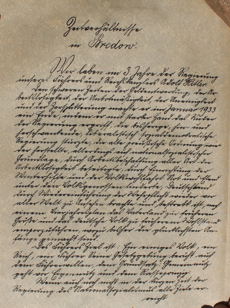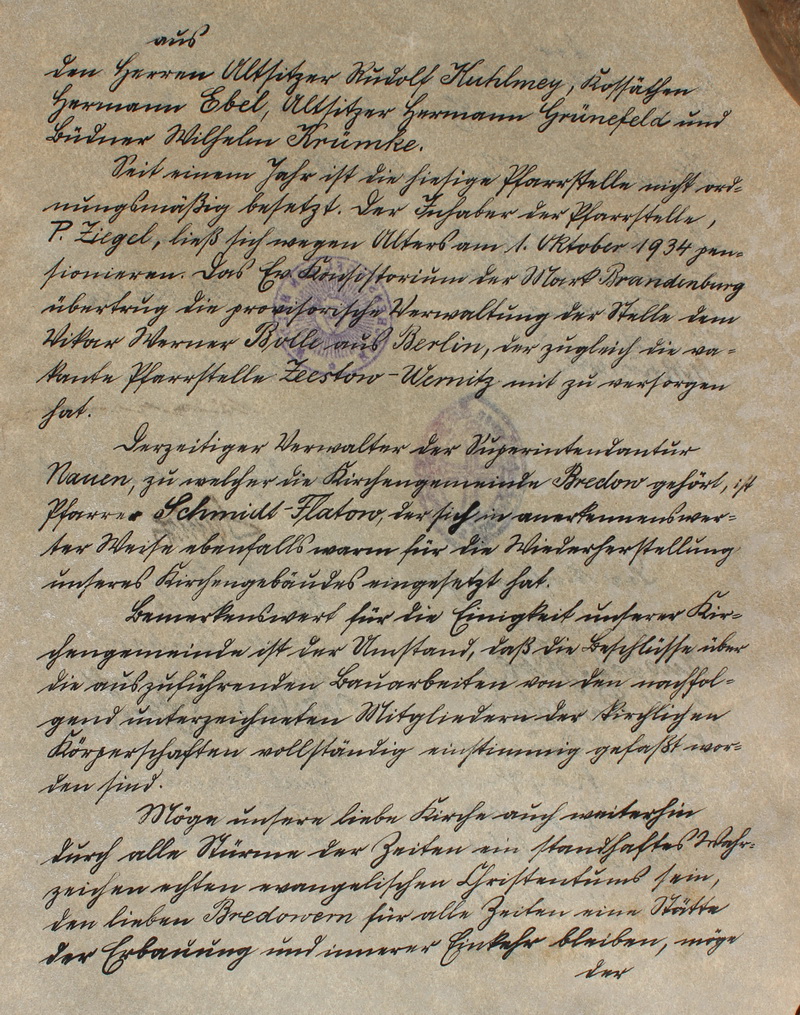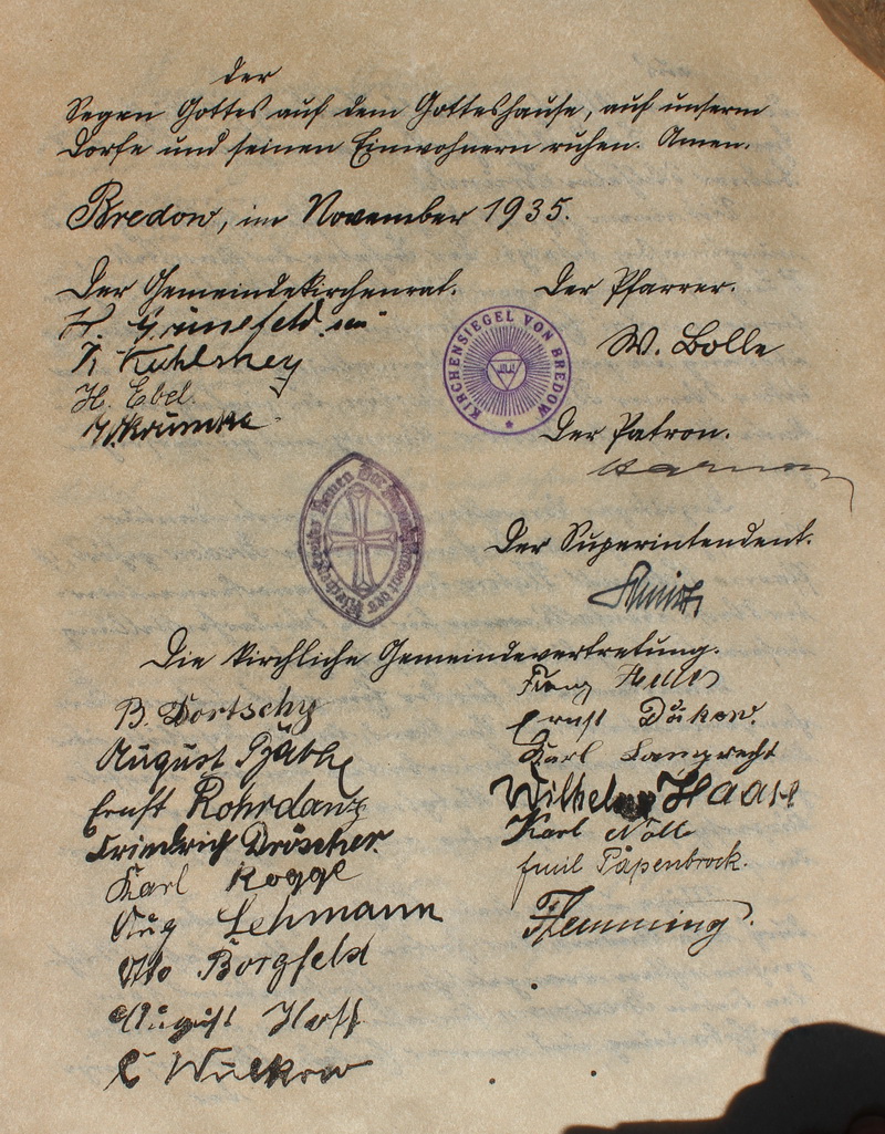 Im Namen ... - Seite 4 der Segen Gottes auf dem Gotteshause, auf unserem Dorfe und seinen Einwohnern ruhen. Amen. Bredow, im November 1935 der Gemeindekirchenrat H Grünefeld sen R Kuhlmey H Ebel W Krümke der Pfarrer W Bolle Der Patron Harney der Superintendent Schmidt [lt Google Grashof bis 1935, danach Bettac. Der Pfarrer Schmidt aus Flatow hatte derzeit die Verwaltung.] die kirchliche Gemeindevertretung [linke Seite] B. Dortschy August Bathe Ernst Rohrdanz Friedrich Dröscher Karl Rogge Aug Lehmann Otto Borgfeld August Hoff C. Wulkow [rechte Seite] Franz Heller Ernst Däkow Karl Lamprecht Wilhelm Haase Karl Nölte Emil Papenbrock Flemming |