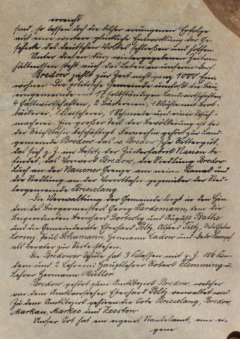 Zeitverhältnisse in Bredow 1935 - Seite 2 erreicht sind, so lassen doch die beisher errungenen Erfolge auch eine weitere glückliche Entwicklung der Ge- schichte des deutschen Volkes schließen und hoffen. Unter diesen kurz wiedergegebenen Zeitver- hältnissen steht auch das Leben in unserem Dorf. Bredow zählt zur Zeit 1000 Ein- wohner. Die politische Gemeinde umfaßt die Bau- erngemeinde mit 17 selbständigen Landwirtschaften, 4 Gastwirtschaften, 2 Bäckereien, 1 Mühle mit Brot- bäckerei, 1 Fleischerei, 1 Schmiede und einer Schuh- macherei. Ein großer Teil der Bevölkerung ist bei der Reichsbahn beschäftigt. Fernerhin gehört zur Land- gemeinde Bredow das v. Bredow'sche Rittergut, das sich z. Z. im Besitz der Zuckerfabrik Nauen be- findet, das Vorwerk Bredow, die Siedlung Bredow- Luch an der Nauener Grenze am neuen Kanal und die Siedlung an der Vorortbahn gegenüber der Sied- lergemeinde Brieselang. Die Verwaltung der Gemeinde liegt in den Hän- den des Bürgermeisters Georg Pardemann, dem die Beigeordneten Bernhard Dortschy und August Bathe und die Gemeinderäte Eberhard Peltz, Alfred Tietz, Wilhelm Lorenz, Paul Schumann, Hermann Cadow und Dedo Sumpf als Berater zur Seite stehen. Die Bredower Schule hat 3 Klassen mit z. Z. 106 Kin- dern und 2 Lehrern: Hauptlehrer Robert Flemming u. Lehrer Hermann Müller. Bredow gehört zum Amtsbezirk Bredow, welcher von dem Amtsvorsteher Eberhard Peltz verwaltet wird. Zu dem Amtsbezirk gehören die Orte Brieselang, Bredow, Markau, Markee und Zeestow. Unser Ort hat ein eigenes Standesamt, eine ei- gene |