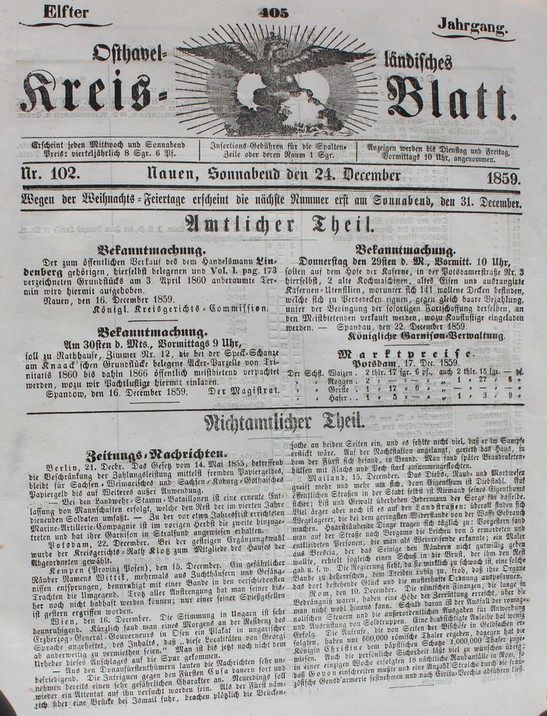 Osthavelländisches Kreisblatt 1859 Der für Bredow interessante Teil des Kreisblattes steht hier. Eigentlich steht in dieser Ausgabe nichts über Bredow drin. Vermutlich wollte man damit nur auf das Jahr des Brandes hinweisen. |