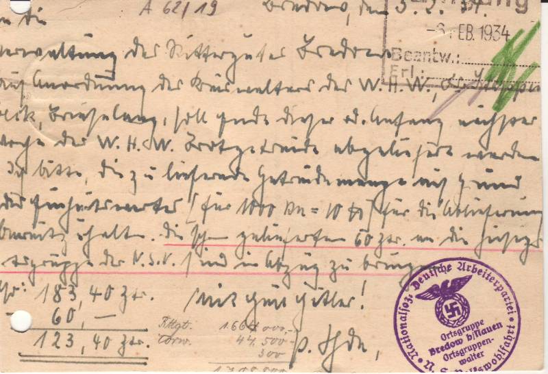 Ein Brief des Ortsgruppenwalters der Ortsgruppe Bredow b/Nauen der NS-Volkswohlfahrt,