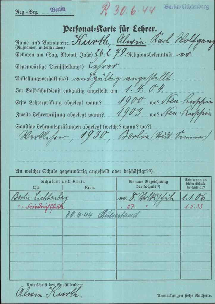 Anstellung am 01.05.1904. Er kündigte zum 01.01.1906, da er eine Lehrerstelle in der Gemeinde Lichtenberg antrat. Trat am 30.06.1944 in den Ruhestand.