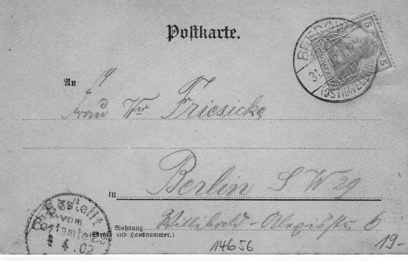 Empfänger: Wittwe Friesicke Berlin SW 29 [Unter der Adresse ist eingetragen: Friesicke, K. - Bahnarbeiter] Willibald-Alexisstr. 6 Abgesandt: 31.03.1902 Zugestellt: ?.04.1902 Rückseite