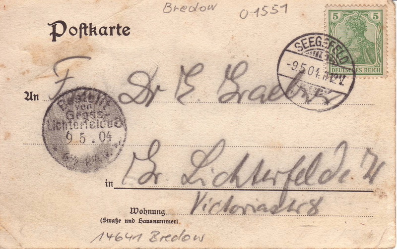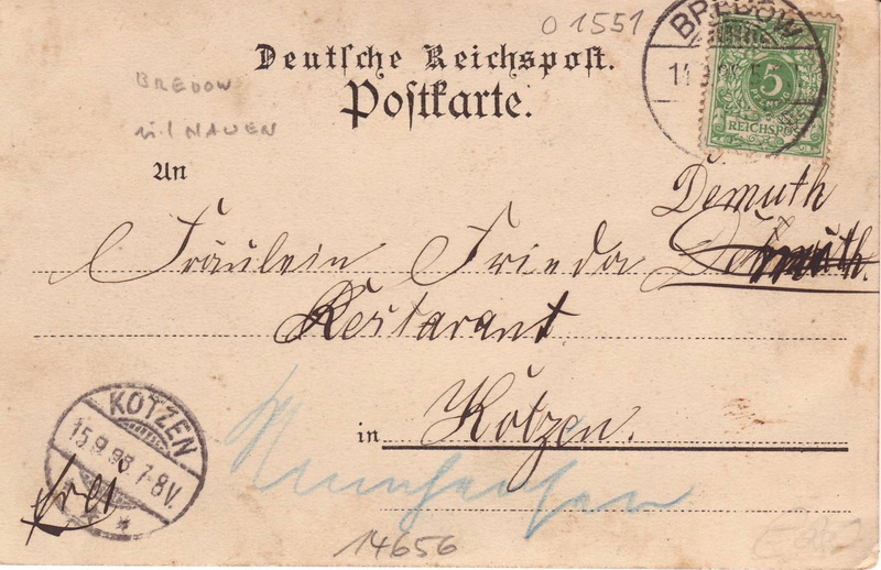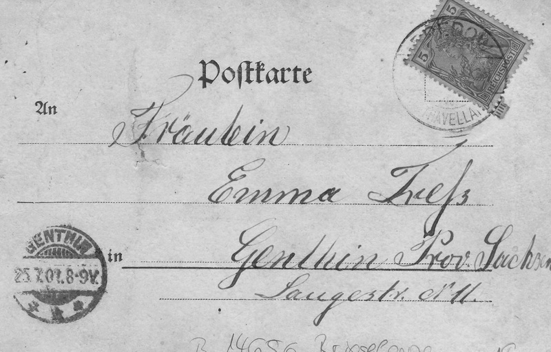 Empfänger: Fräulein Emma Trefs Genthin Prov, Sachsen Saugestr. Nr. 11 Absender: Emma Dietrich. Abgestempelt wurde die Karte im Postamt Bredow. Rückseite