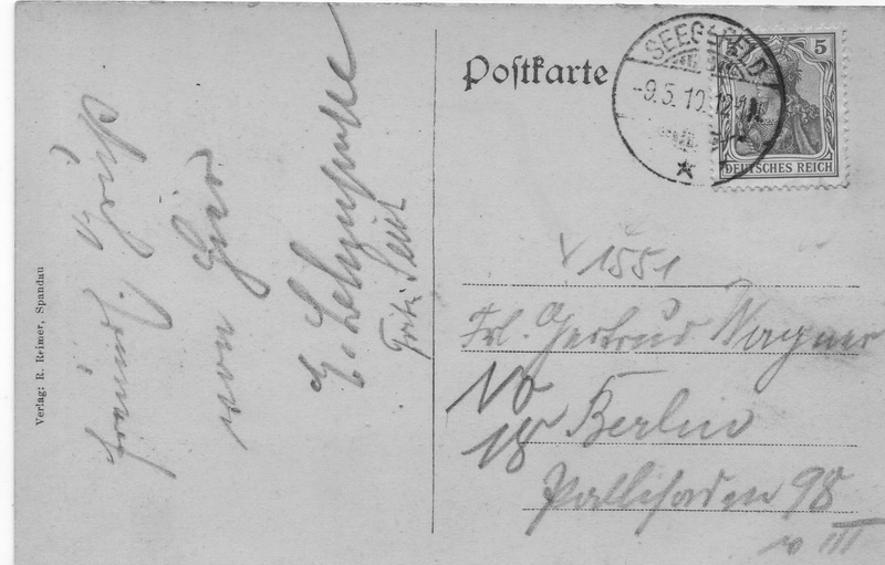 Empfänger: Frl. Gertrud Wagner Berlin NO 18 Pallisaden 98 [Adressbuch 1910: Wagner, M. - Schneiderin] Absender: E. Lehn?, Fritz Seibt Abgestempelt wurde die Karte in Seegefeld. Rückseite