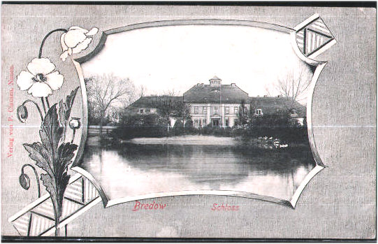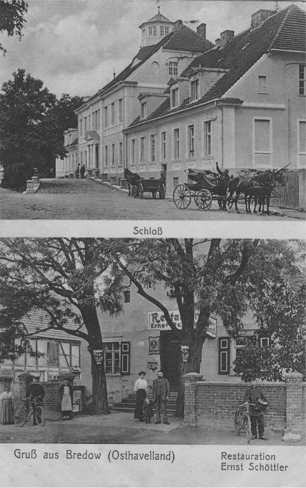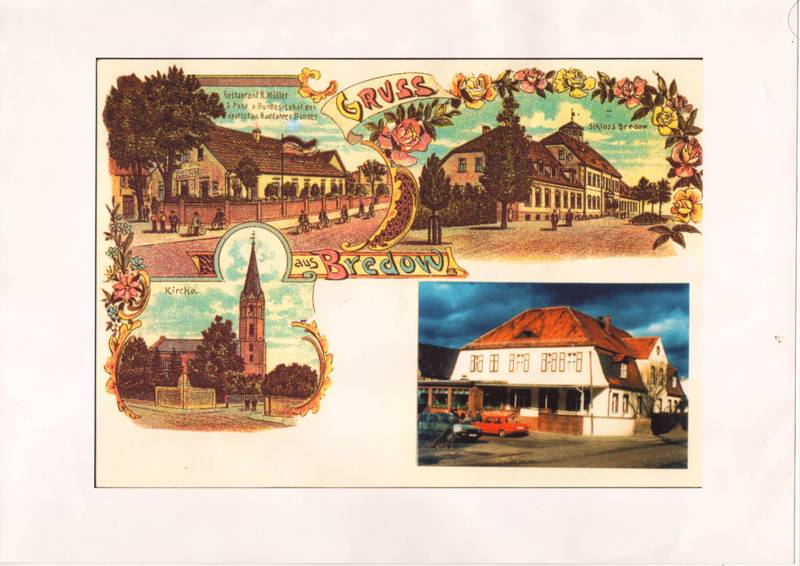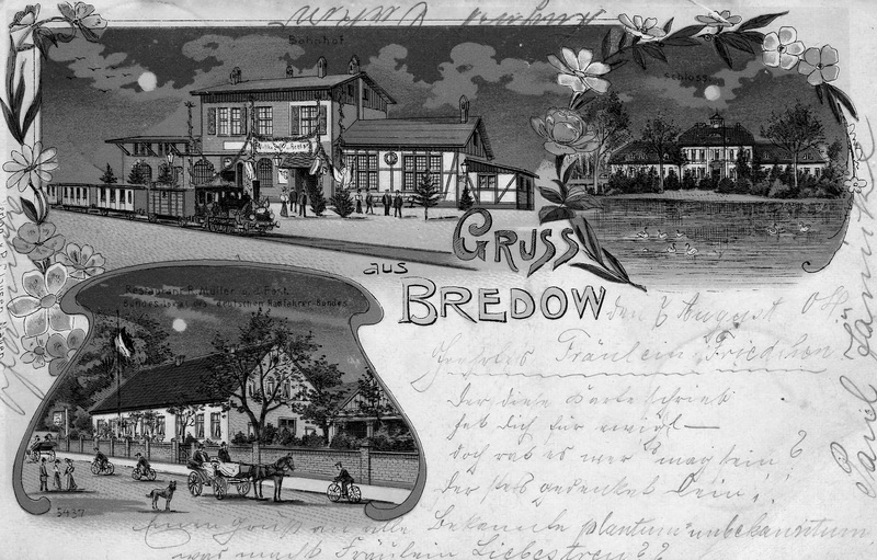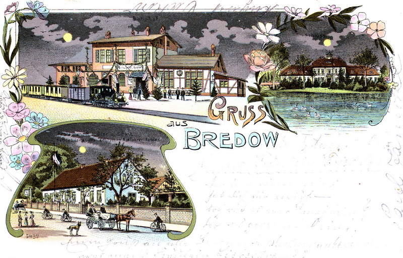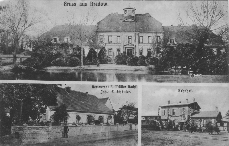 Alte, handkolorierte Aufnahmen. Oben links der Bahnhof Bredow, eröffnet 1902. Rechts das Schloß in alter Darstellung mit Teich