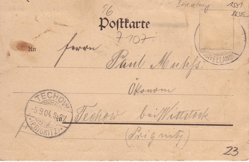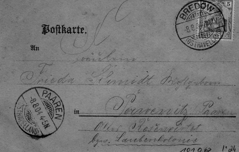Datum: 08.08.1904 Empfänger: Frieda Schmidt ?? Perwenitz / Paaren Alter Rasen?? bzw. Laubenkolonie Absender: Paul Jänicke Abgestempelt wurde die Karte in Bredow. Rückseite