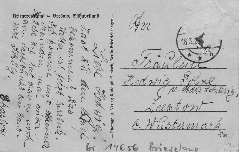Datum: 18.03.1929 Empfänger: Fräulein Hedwig Golze ? Adr. Schurig Zeestow b. Wustermark Absender: Charlotte Rückseite