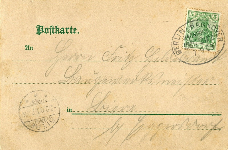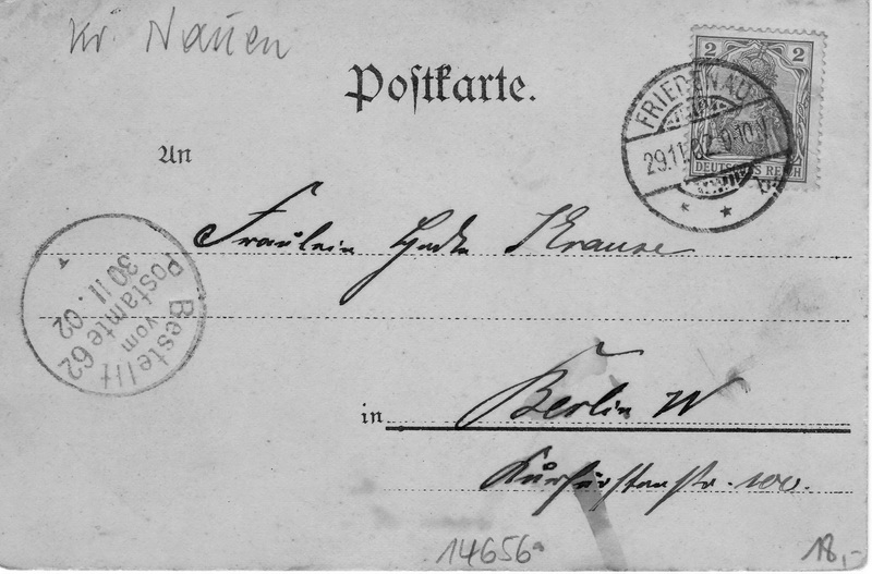 Empfänger: Fräulein ? Krause Berlin W Kurfürstenstr. 100 [Anm.: Unter dieser Adresse ist in den Adressbüchern von Berlin 1900-1902 kein Krause eingetragen. Verm. Dienstmädchen] Abgesandt: 29.11.1902 in Friedenau Zugestellt: 30.11.1902 vom Postamt 62 Rückseite