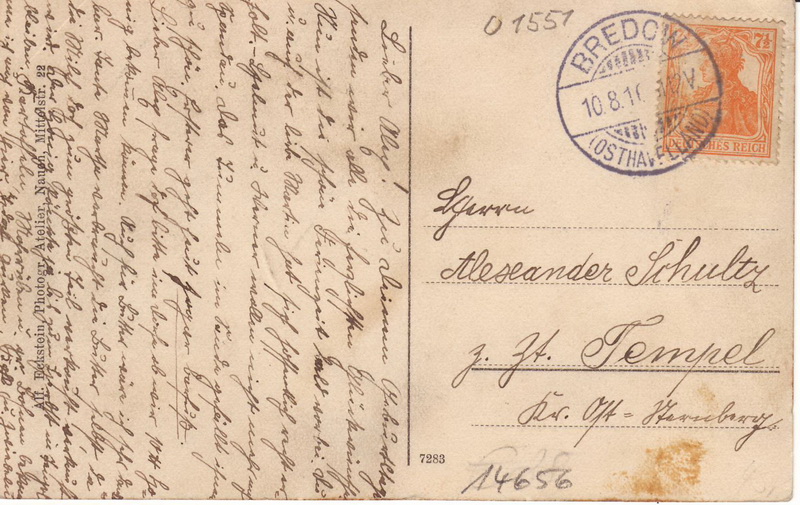 Empfänger: Alexander Schultz Tempel Kr. Ost-Sternberg Abgesandt: 10.08.1910 Rückseite