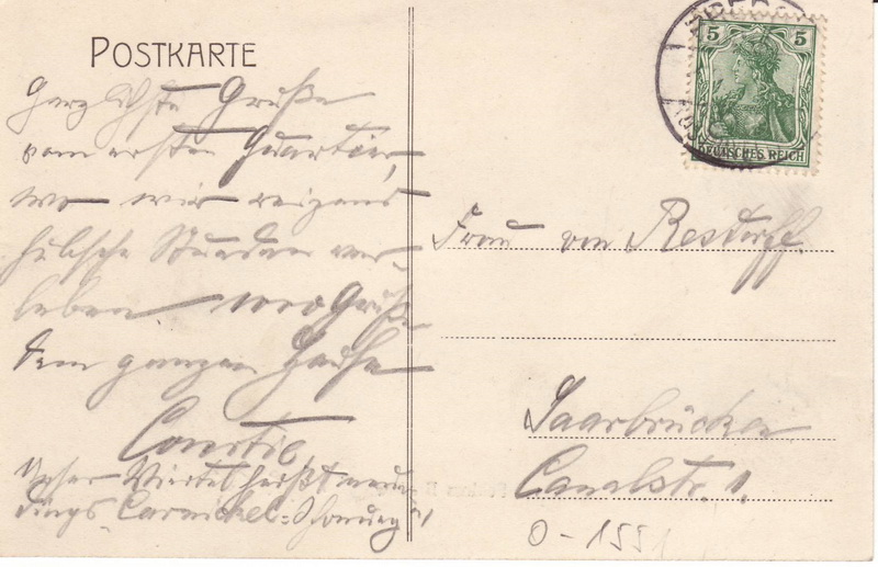 Datum: 31.08.1908 Absender: unbekannt Empfänger: Frau von Restorff [Wikipedia, Familienverband], Saarbrücken, Canalstraße 1 Google-Maps Rückseite