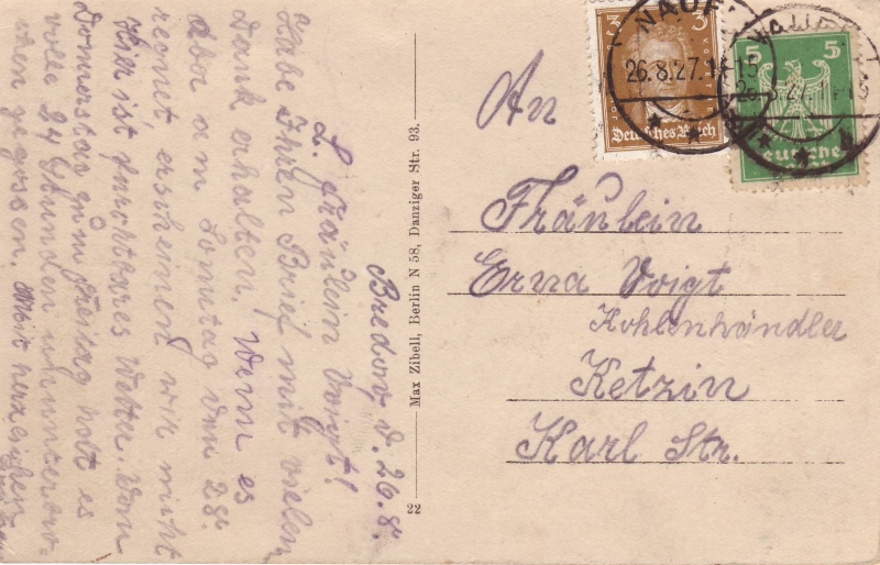 Datum: 26.08.1927 Absender: Elli Däkow, Elsa Dröscher, Charlotte Schöttler Empfänger: Erna Voigt, Kohlenhändler, Ketzin Karl Str. Rückseite